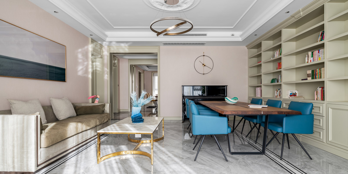 褪去城市繁冗華麗的外殼,回歸至與人的內在共鳴,斑駁的光影在客廳空間徜徉,大理石與墻板的搭配,釋放出一種優雅、沉靜及治愈的氛圍感,貫穿于整個別墅裝修空間的動線。
